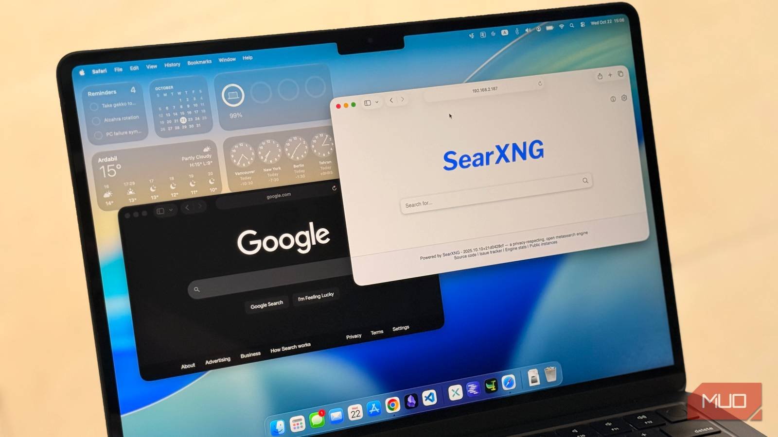 a laptop showing google and searxng home pages next to each otherjpeg