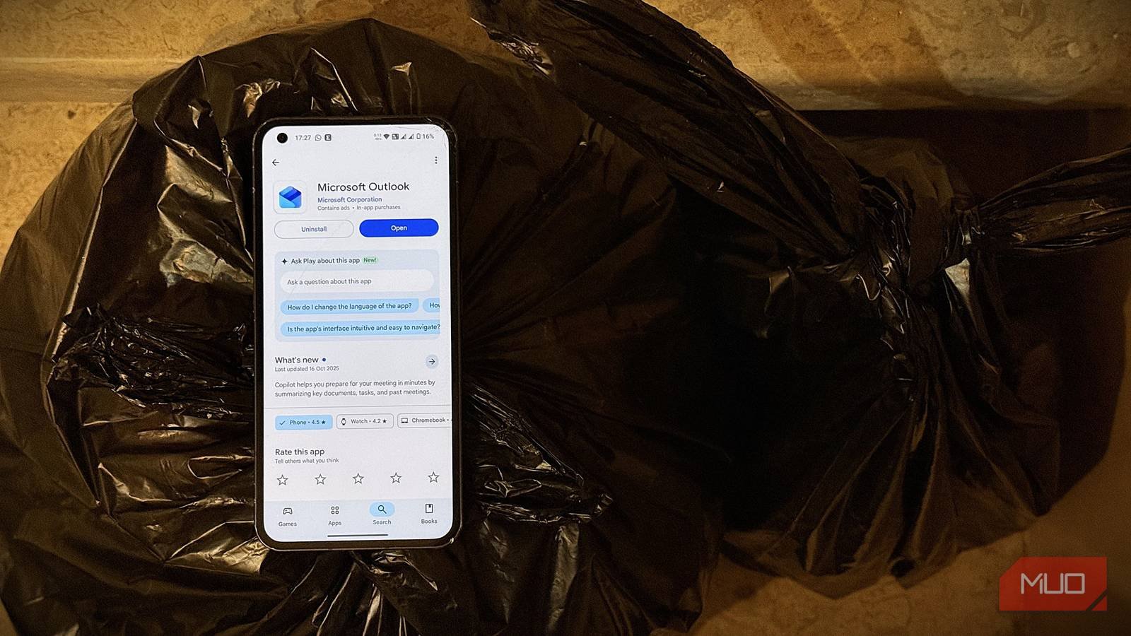 a smartphone on a bag of trash with the microsoft outlook app on the displayjpg