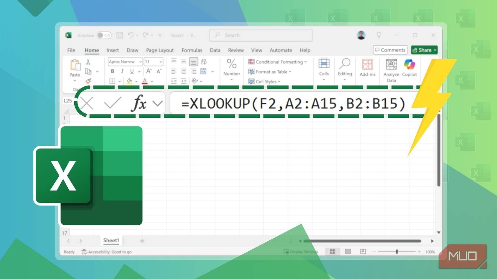 excel spreadsheet with xlookup function in the formula bar and a thunder with excel logo in the fronjpeg