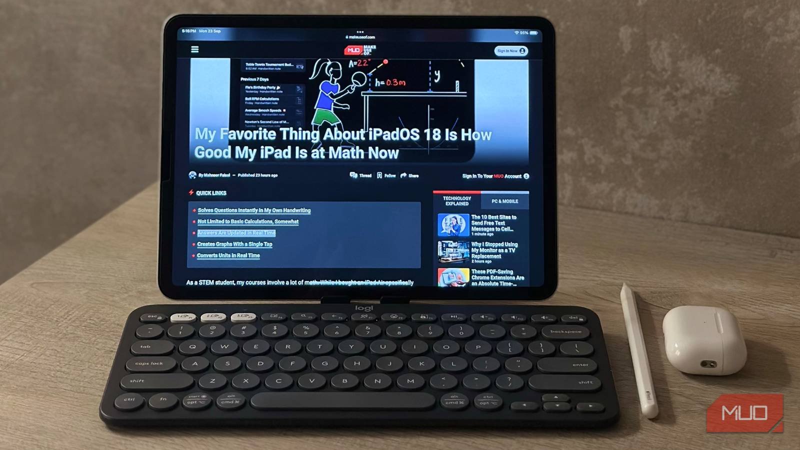 ipad alongside an apple pencil logitech pebble 2 keyboard and airpods arranged on a table 1jpg