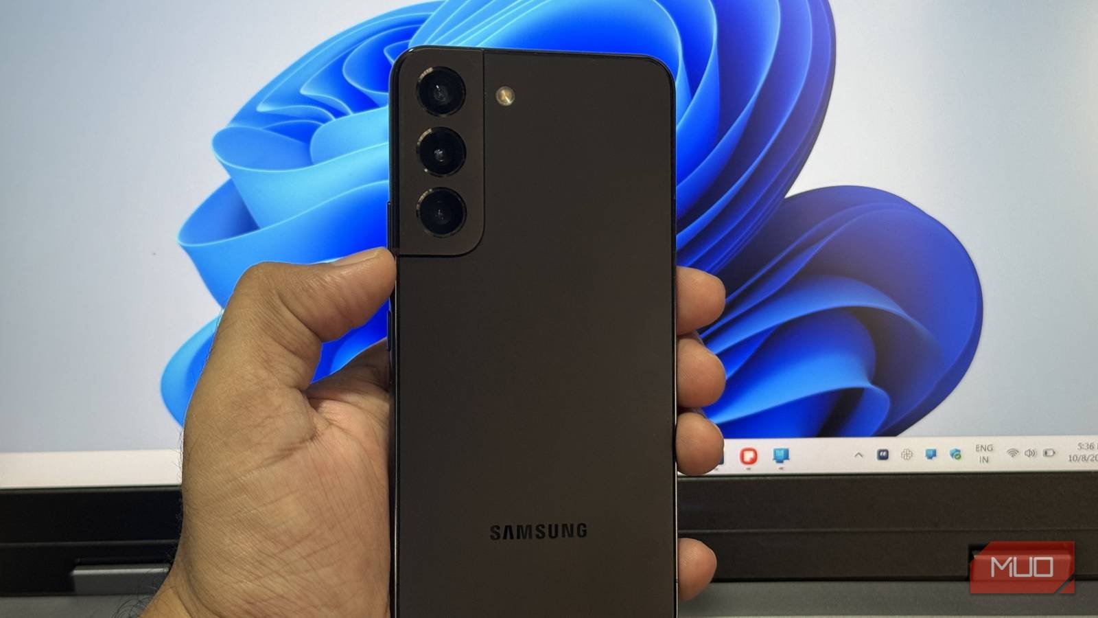samsung s22 phone in hand with windows laptop in backgroundjpg